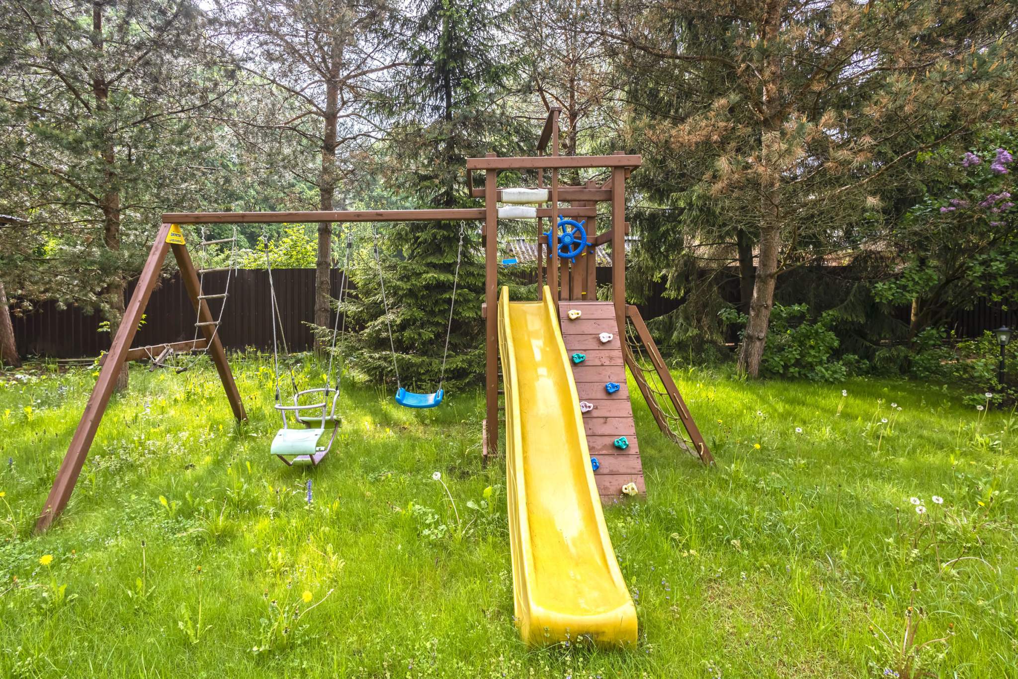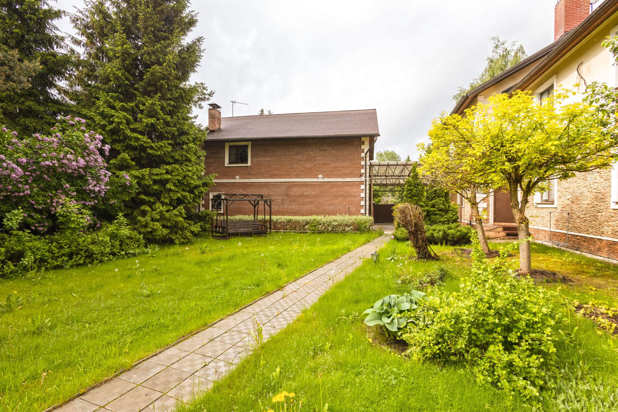 Ухоженная территория участка с беседкой и зоной барбекю, детская площадка, плодовые деревья, хвойники.
